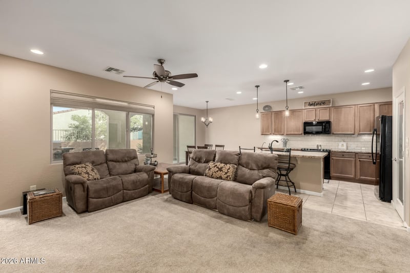 Listing details for 5867 Turquoise Ln, Eloy, AZ 85131 : CHOLLA MODEL on a PREMIUM LOT — fully furnished! Includes an EZ-Go golf cart. Enjoy stunning Butte views from the back patio with added privacy wall and view fencing. This home offers 2 bedrooms, 2 baths, a den, and a 2-car garage with built-in cabinets and epoxy floors. The kitchen features granite countertops, subway tile backsplash, soft-close dovetail drawers, convection oven, Beech cabinetry, RO system, and pendant and under-cabinet lighting. Highlights include 18x18 tile, window coverings, wood-framed mirrors, water softener, recirculating pump, decorative fans and lighting, and fresh interior paint. Relax on the covered patio and take in the views—exterior maintenance and landscaping are included.