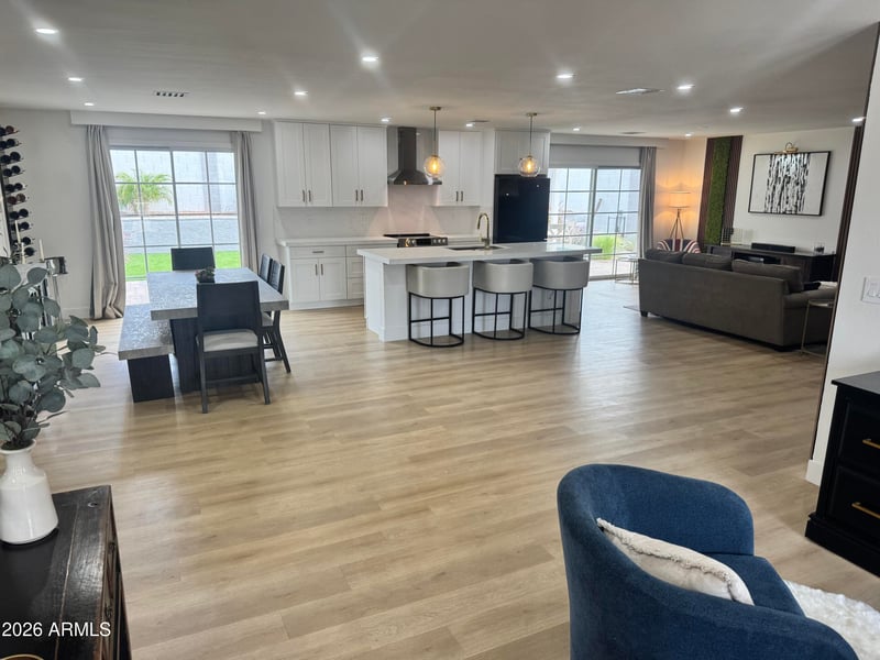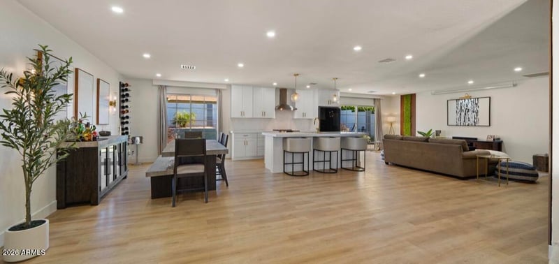 Light-filled 4-bedroom, 2.5-bath with open-concept living, custom kitchen, new flooring throughout, and added laundry.