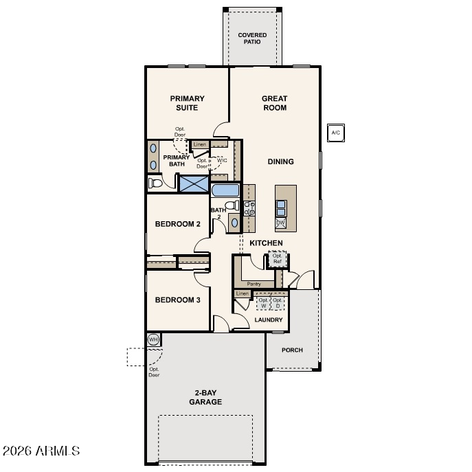 Listing details for 5923 Sideoats Way, San Tan Valley, AZ 85143 : The Alder in the Highland Collection at Skyline Village features an open-concept design with intentionally placed private spaces, creating a natural flow that suits the Arizona lifestyle. The front entry opens into an inviting kitchen, complete with a spacious pantry and designed to anchor daily life. From the kitchen, a hallway leads to two secondary bedrooms, a full guest bath, and a conveniently placed laundry room with an interior linen closet.
