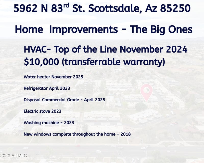Listing details for 5962 83rd St, Scottsdale, AZ 85250 : No restrictions on seasonal rentals -- offering exceptional flexibility for investors, part-time residents, or those looking for the perfect lock-and-leave Scottsdale retreat. Ideally located just moments from Chaparral Park, this Scottsdale townhome puts you right in the heart of one of the area's most loved outdoor destinations with walking and biking trails, lakes, baseball and soccer fields, community pool, and a fabulous dog park. The big-ticket items are already completed, including HVAC, roof, and appliances, giving buyers peace of mind while leaving the opportunity to add their own personal design touches to the interior. Enjoy an oversized back patio, perfect for relaxing, entertaining, or enjoying Arizona's beautiful weather. Just minutes from Old Town Scottsdale, dining, shopping, golf, and entertainment, this home offers the perfect blend of location, lifestyle, and opportunity. Opportunity, location, and lifestyle -- all waiting here.