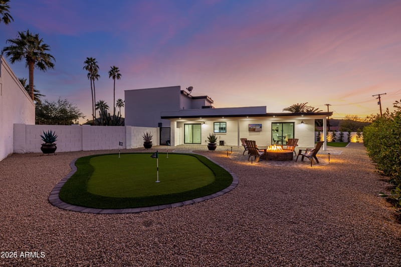 Listing details for 6 Piping Rock Rd, Phoenix, AZ 85022 : Remarkably renovated w/modern design & attention to detail, exclusively tucked away in a private cul-de-sac lot within one of Moon Valley's most desirable communities! Spacious open floor plan w/nearly 2000sqft downstairs livable space, primary bedroom downstairs (only 1 bed & 1 bath upstairs). Expansive kitchen & greatroom w/24ft exposed beam, picture windows, smooth texture walls & ceiling throughout. Countless interior design possibilities! Under staircase lighting & modern railing. Newly installed (April 2025) 200amp electrical panel, 2025 electric tankless water heater, TRANE 5-Ton, 14 SEER AC unit (2024). Stylish En Vogue features, upgrades & design throughout interior & generous outdoor living space, patio, firepit, landscape lighting, putting green. Owner/occupants can be 40+.