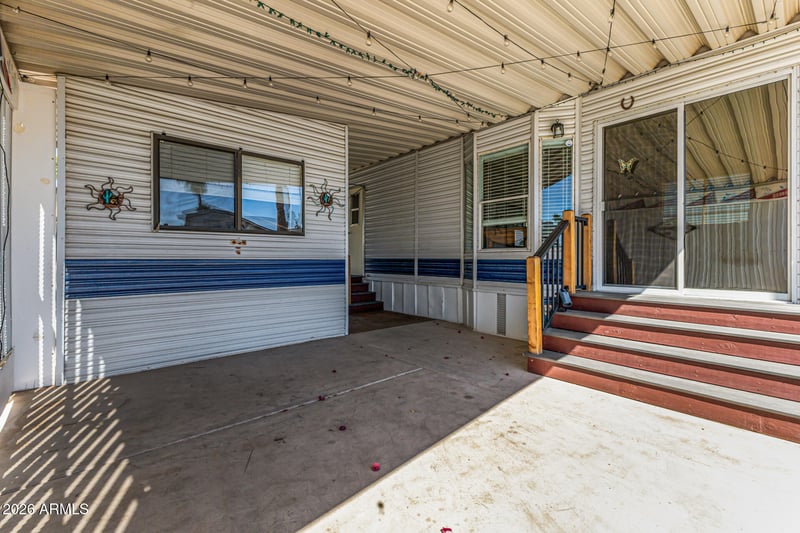 Listing details for 600 Idaho Rd #353, Apache Junction, AZ 85119 : Discover the charm of this mobile home in the active adult Community of Rock Shadows! A carport parking is just the beginning. Enter to find a desirable great room! Vaulted ceilings add to the airy feel, complemented by abundant natural light, a neutral palette, and wood-look flooring throughout. Cozy dining area with a bay window. The kitchen boasts matching appliances, a pantry, and ample wood cabinetry w/crown molding. With 1 bed & 1 bath, this home is great for anyone looking to enjoy low-maintenance living. The bedroom has a built-in closet & cabinets for more storage. The detached laundry room can be a storage room as well. If you want to relax, there is an additional seating area with sliding doors to the back! Enjoy the Community pool, spa, sports courts, and more. Make this yours!