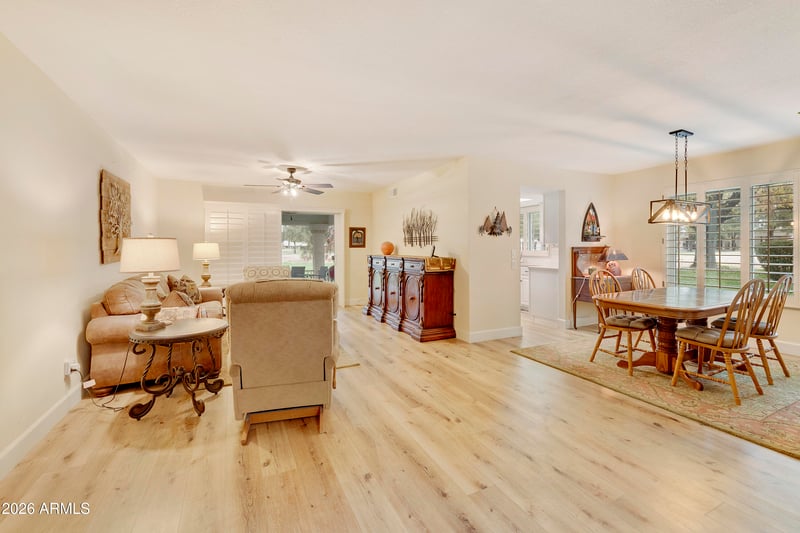 Listing details for 602 Palo Verde Way, Mesa, AZ 85208 : Welcome Home to the highly sought-after 55+ Fountain of the Sun community! This beautifully updated end unit is perfectly positioned on a golf course lot with serene golf course and tree views. Enjoy laminate and tile flooring (2019), dual-pane vinyl windows, and a new HVAC system (2019). The split master suite offers a walk-in closet and a fully remodeled master bath (2025). The kitchen was partially updated in 2019 with updated appliances, including an electric range, built-in microwave, dishwasher, refrigerator, and disposal. Features include formal dining plus an eat-in kitchen, washer and dryer in the garage, partial plumbing updates (2025), and a partially updated roof (2025). CLICK MORE... Relax or entertain on the expansive west-facing covered patio, ideal for enjoying Arizona sunsets. Conveniently near US 60 and Red Mountain Freeway, Mesa Gateway Airport, Sky Harbor, and Costco. Enjoy Country Club and Golf Community amenities, including a lake, golf course, pickleball, bocce ball, fitness, billiards, library, and Birdie's Restaurant open daily.