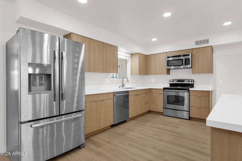 Listing details for 6025 Boise St, Mesa, AZ 85205 : FULLY REMODELED 2-bedroom, 2-bath home with bonus room in Mesa. Renovated in 2026 with new flooring, new roof, updated kitchen, and remodeled bathrooms. Open-concept layout connects living, dining, and kitchen areas with recessed lighting and wide-plank flooring throughout. Kitchen features quartz countertops, modern cabinetry, stainless steel appliances, and breakfast bar seating. Spacious living area includes a floor-to-ceiling stone fireplace and large windows for natural light. Primary suite includes ensuite bath and sliding barn-style door. Bonus room offers flexible use as office, den, or additional sleeping space. Additional features include ceiling fans, updated lighting and indoor laundry area. Backyard space offers potential for outdoor seating or garden setup. Dreamland Villa in Mesa, Arizona is a vibrant 55+ community offering a variety of amenities, including: **Clubhouses: Read Hall with activity rooms, a library, fitness center, and ceramics studio; Farnsworth Hall for events, a performance theater, and game rooms. **Recreation Facilities:** Two heated outdoor pools, hot tubs, pickleball, tennis, and shuffleboard courts. Located 1.2 miles to Alta Mesa Golf Club, and shopping/dining options. Approx. 4-5 miles to Superstition Springs Center and 6-8 miles to Usery Mountain Regional Park with hiking and outdoor recreation.