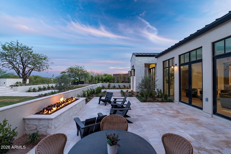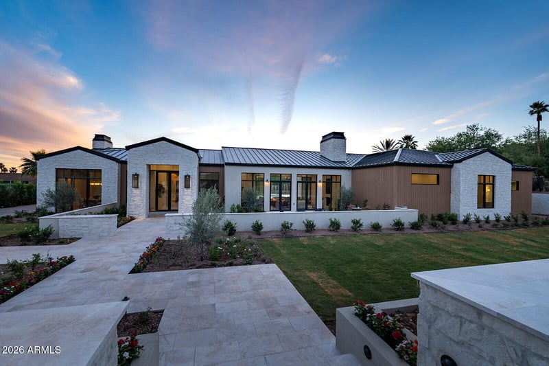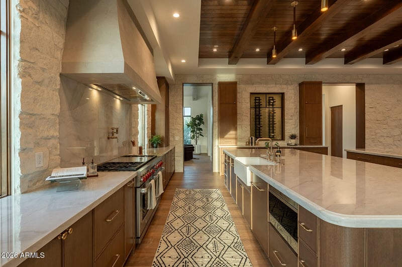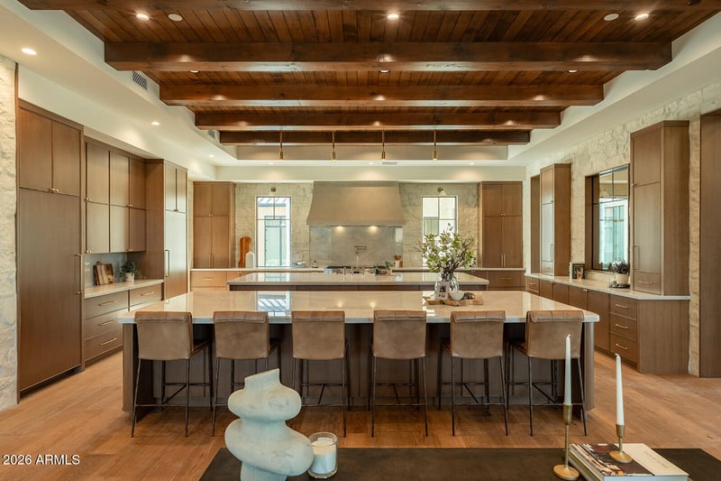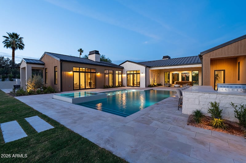 Listing details for 6032 Palo Cristi Rd, Paradise Valley, AZ 85253 : Introducing the newest development from Travis Custom Homes, SMITH and Kozi Design in Paradise Valley, an exceptional nearly 7900 SF estate inspired by the hills of Montecito. Featuring 5 bedrooms, 6.5 baths, an office, bonus room, and dedicated TV room, this home blends luxury with an organic, timeless feel. Rich stone and dark wood elements pair with exposed beams and tongue-and-groove detailing throughout. Entertain effortlessly in the large kitchen featuring two huge islands and has seamless indoor/outdoor flow. The resort-style backyard offers a pool and spa, fireplace and private championship style pickleball court. Complete with a massive 5-car garage and fully livable 1 bed, 1 bath guest house.