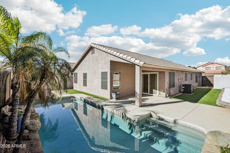 Listing details for 6055 Rochelle St, Mesa, AZ 85215 : Welcome to 6055 E Rochelle St, a home that exudes elegance and comfort. The kitchen is a chef's dream with all stainless steel appliances, an accent backsplash, and a functional kitchen island. The primary bathroom is a sanctuary with a separate tub and shower, and double sinks for added convenience. Outside, you'll find low maintenance landscaping, a covered patio perfect for entertaining, and a private in-ground pool. The fenced in backyard ensures privacy and security. This home is a perfect blend of style and functionality. Don't miss out on this gem!. 100-Day Home Warranty coverage available at closing
