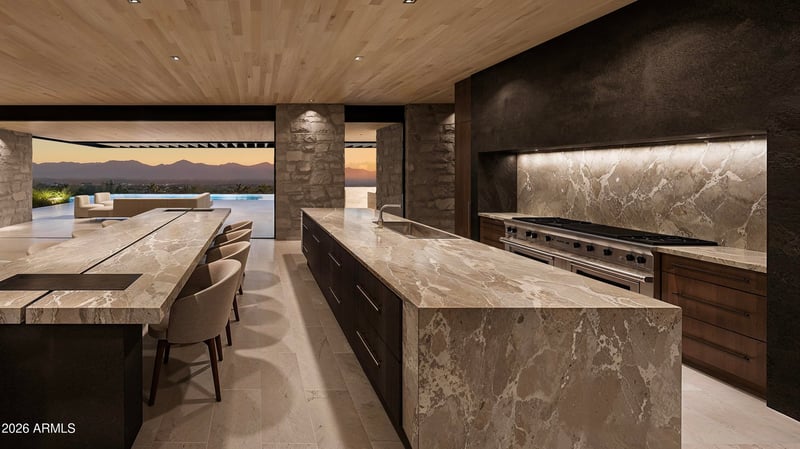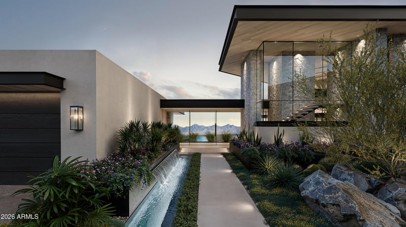 Listing details for 6203 Cholla Ln, Paradise Valley, AZ 85253 : Set high on the prestigious north side of Camelback Mountain, this newly constructed architectural estate captures some of the most breathtaking views in all of Paradise Valley. Positioned on an elevated 1.8 acre homesite, the property overlooks sweeping vistas of the McDowell Mountains, Pinnacle Peak, and the sparkling city lights stretching across the Valley. Designed by renowned architect Stratton Andrews with interiors by acclaimed designer Holly Wright, the residence blends modern desert architecture with warm, refined finishes. The home is thoughtfully designed to frame the surrounding landscape through walls of glass and expansive outdoor living spaces. Spanning approximately 9,000 square feet of livable space with additional lower-level flex areas, the floor plan offers an exceptional balance of grand entertaining and private retreat. The main living areas feature dramatic ceiling heights, a stunning great room, formal dining, a chef's kitchen with secondary prep spaces, wine storage, and seamless indoor-outdoor flow to the resort style pool and spa overlooking the valley below. The lower level is designed for lifestyle and entertainment, featuring a private gallery space, golf simulator, gym, lounge areas, and additional storage. Upstairs guest suites are positioned to capture mountain views while maintaining privacy for both owners and guests. Outdoor amenities include expansive terraces, fire features, multiple entertaining areas, and an infinity-edge pool that visually connects the home to the surrounding desert landscape. A spacious four-car garage, elevator, and thoughtfully integrated smart home features complete the residence. This is a rare opportunity to own a newly built architectural showpiece on one of the most iconic view lots on Camelback Mountain.
