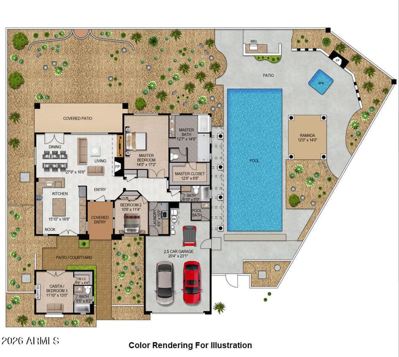 Listing details for 6231 Evening Glow Dr, Scottsdale, AZ 85266 : 3 Bed | 3.5 Bath | 2.5-Car Garage Immensely popular but rare VAGA GREATROOM with Casita floor plan that is Loved for ZERO wasted space & the large eat-in island kitchen with tons of cabinets that is wide open to the greatroom. BRAND NEW HVAC! Two distinct outdoor experiences -- a true resort backyard on one side, and a quiet cactus garden on the other, connected by a natural decomposed granite path. CLICK MORE FOR FEATURES LIST FEATURES A decomposed granite path winds naturally through a curated desert cactus garden to the pool, creating a softer, more authentic connection between the home and outdoor living. 3 Bed, 3.5 bath, 2.5 car garage 2.5 car garage Oversized lot Some mountain views Horseshoe-shaped street South exposure Sides to preserve Popular Vaga Model Perfect Privacy Pool bath Sits high above the street Large Private front courtyard Quartzite java Marron leathered tops Double atrium doors to courtyard and from the house Wide plank outlook LVP Kitchen Black Tambor cabinets w/ cool brass pulls and matching backsplash Oversized SS Krause undermount sink workstation w/square edge Large island with storage, wine cooler and microwave Waterfall sides Lots of extra LED can lights some with halo night lights Kitchen wide open to greatroom Fisher and Paykel appliances Desk unit in kitchen Split dishwasher Atrium doors to backyard Seemless epoxy floors in casita offering clean modern look and easy maintenance Plantation shutters PRIMARY Wood look LVP Large master closet with custom builtins and ladder Large windows for lighting Copacabana lighting Dual headed walk in shower no door needed floor to ceiling tile The focal point is the floating-style double vanity with flat-panel white cabinetry and long matte black pulls. The countertop has a soft, natural stone look with subtle movement, adding just enough texture without competing for attention. Integrated rectangular sinks and sleek black fixtures keep everything crisp and contemporary. POWDER ROOM Custom vanity Stone tile wraps the lower walls with a diagonal pattern, paired with a dark band for contrast. There's a round vessel sink on a darker cabinet with black wall-mounted fixtures. Laundry has butcherblock counter top and storage full size whirlpool W&D with stands Garage Tankless water heater Soft water Atrium access door to the pool bath Phantom Screen doors Storage cabs Room for golf cart OUTDOOR living Large heated lap pool with electric cover Gutters Electronic Shade screen Cactus garden Huge ocotillo and a full sized saguaro Stuccoed interior fences Built in Hot tub Natural gas fireplace Gazebo with lights and builtin heater Built in ss BBQ and beverage cooler Desert Oasis Great drainage 2 yards, cactus garden and play yard Two distinct outdoor experiences -- a true resort backyard on one side, and a quiet cactus garden on the other, connected by a natural decomposed granite path. Most homes give you one backyard. This one gives you two -- a resort-style setting with pool, spa, outdoor kitchen, and heated ramada on the south side, and a separate, quiet cactus garden where a decomposed granite path winds naturally through the landscape, creating a softer, more authentic connection back to the pool.