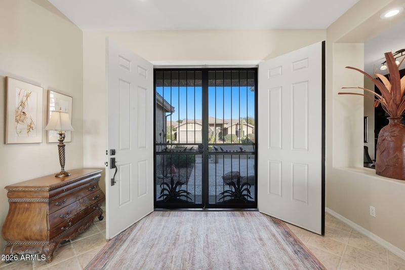 Listing details for 6280 Sandtrap Dr, Gold Canyon, AZ 85118 : A Masterpiece of Perfection on a Premier Golf Course Lot! Situated on an expansive 1/3+ acre golf course, resort-style location! Thisimpeccably updated home is thoughtfully designed, meticulously maintained, and absolutely unforgettable. From the moment you arrive, you're welcomed by a private front courtyard that sets the tone for what lies beyond. Double entry doors open to a dramatic first impression, where the iconic wall of windows immediately captures breathtaking views of the lush golf course and stunning resort-style backyard,a view that defines resort living. The interior is adorned with elegant diagonal-set stone tile throughout, complemented by plush, luxurious carpeting in the bedrooms. The open great room is both sophisticated and inviting, featuring a custom, lighted entertainment wall with art niches, perfect for showcasing your style.