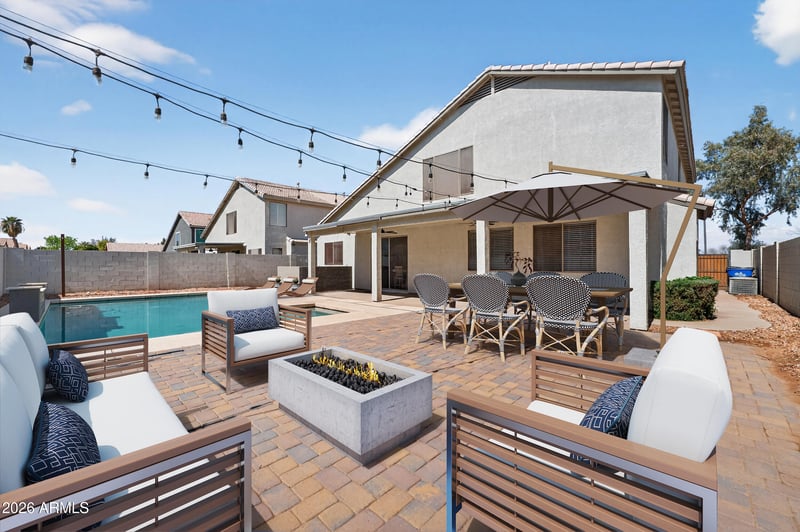Listing details for 629 Orchid Ln, Gilbert, AZ 85296 : This beautifully updated 4 bedroom, 3 bathroom home with a spacious loft offers the perfect blend of comfort, functionality, and location. Thoughtfully designed with a full bedroom and bathroom on the main floor, the layout is ideal for guests, multi generational living, or a private home office. The kitchen features an abundance of cabinetry, granite countertops, and generous prep space that flows seamlessly into the main living areas. Granite continues throughout the bathrooms, while new carpet in all bedrooms, updated LVP flooring, and modern light fixtures bring a fresh and elevated feel to the entire home. Built in audio throughout the house adds an extra layer of convenience for entertaining or everyday living. Step outside to the full length covered patio with ceiling fans provides the perfect shaded space to relax while overlooking the stunning pool with a water feature and low maintenance landscaping. A brand new HVAC system keeps the home comfortable through the summer months, while paid for solar helps keep energy costs down. The 3 car garage offers plenty of room for vehicles and storage, and the home sits directly across from a large greenbelt giving you open space right outside your door. Located just minutes from Downtown Gilbert and around the corner from Gilbert Town Square with restaurants, a movie theater, bowling, and entertainment, this home offers the ideal combination of modern updates and an unbeatable location.