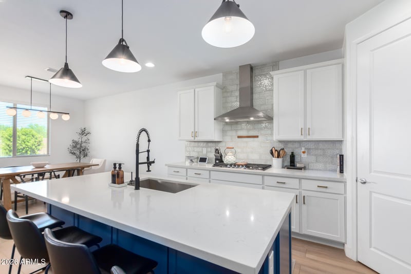 Listing details for 638 Lowell Dr, San Tan Valley, AZ 85140 : Welcome home to your 3 bedroom plus den, 2.5 bath home in The Parks. Eat in kitchen features quartz countertops, gas cooktop with hood vent, walk in pantry, kitchen island with breakfast bar, stainless steel appliances, two tone cabinetry, tile backsplash and opens to great room with super slider door. Primary suite features walk in super shower, dual sinks, walk in closet. Backyard with covered paver patio, grassy play area and view fence over looking community space. Home has amazing natural light. 2 car garage with extended paver driveway. Close proximity to Queen Creek Olive Mill, shopping, schools, restaurants and more.