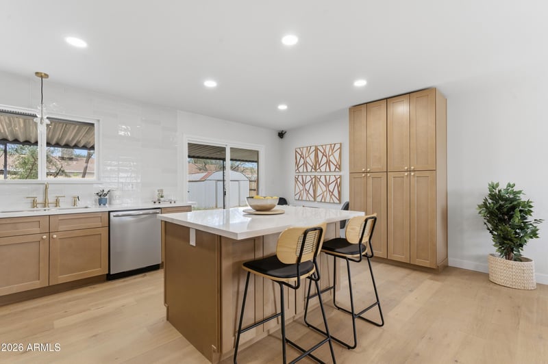 Listing details for 6408 Avalon Dr, Phoenix, AZ 85033 : Thoughtfully remodeled 2-bed, 1-bath home featuring quality name-brand fixtures and designer finishes rarely found at this price point. Enjoy new real wood flooring, fresh interior paint, dual-pane windows, updated kitchen and bathroom, open floorplan, ceiling fans, recessed lighting, fixtures, and hardware throughout. The kitchen showcases a hand-finished Venetian plaster range hood, quartz countertops, full-height tile backsplash, slide-in stainless steel range, kitchen island with seating, and pantry storage. The bathroom features full-height tub surround tile and a real wood vanity with marble top. Large backyard with RV gate and slab parking for up to five vehicles. Minutes from Westgate, State Farm Stadium, Desert Diamond, GCU, and downtown Phoenix.