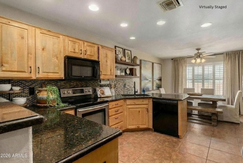Listing details for 6413 171st Ln, Waddell, AZ 85355 : Rare find with DETACHED GUEST HOUSE offering full kitchen, 2 bedrooms, 2 baths, laundry & living space—perfect for multigenerational living, guest accommodations, rental income or short term rental. Nestled on just over an acre of flood-irrigated horse property, this estate captures stunning White Tank Mountain views & majestic Arizona sunsets. Main home showcases 3 bedrooms, 2 baths, an open concept floor plan & 2-car garage. Elegant upgrades include granite counters, tiled backsplash, spa-inspired walk-in shower with dual heads, tile & LVP flooring. Outdoor living impresses with covered patio, extended paver decking, block & wrought iron fencing, fire pit & pergola—your private resort-style oasis designed for relaxation & entertaining. Enjoy the charm of country living in Waddell.