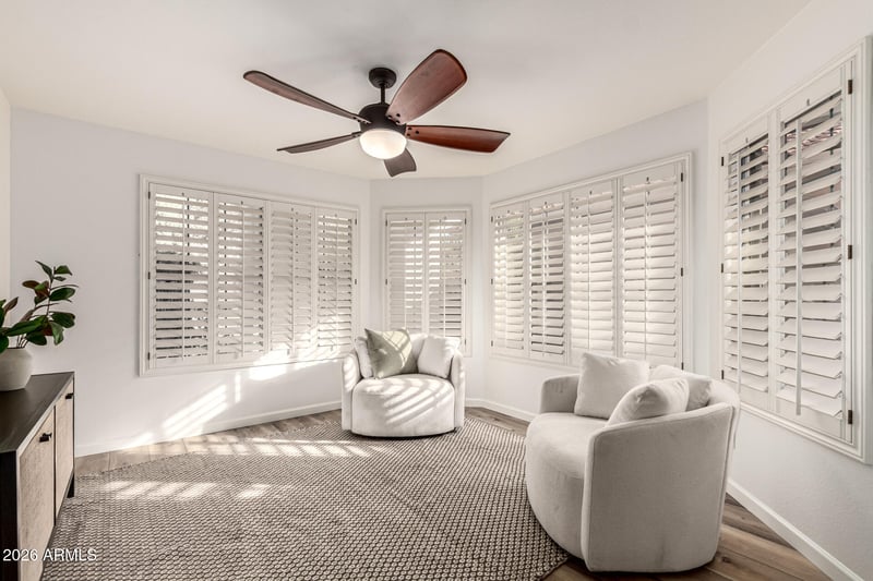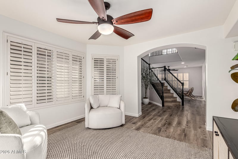 Listing details for 6455 Raftriver St, Mesa, AZ 85215 : Stunningly renovated and perfectly positioned on a premium golf course lot, this exceptional home offers 2,445 sq. ft. of beautifully designed living space. A welcoming foyer opens to plank flooring throughout, a bright seating area ideal for a den or home office, and a spacious family room perfect for everyday living and entertaining. The chef-inspired kitchen shines with modern cabinetry, sleek quartz countertops, subway tile backsplash, stainless steel appliances, and a convenient breakfast bar, while the adjacent dining area is warmed by a cozy fireplace. Upstairs, enjoy a versatile loft, two generously sized guest bedrooms, and a luxurious primary suite featuring a gorgeous en suite bath and private deck overlooking the golf course. The serene backyard backs directly to the course and showcases a covered patio, mature landscaping, and view fencing for year-round relaxation. The garage features a 220v outlet for EV charging. HOA dues include front yard maintenance and cable TV. Located just minutes from schools, recreation, shopping, and dining! The Red Mountain Ranch Country Club amenities are available with a separate membership fee, including including a pool, clubhouse, fitness facilities, golf and more (not included in HOA dues). This beautiful home is a MUST SEE!