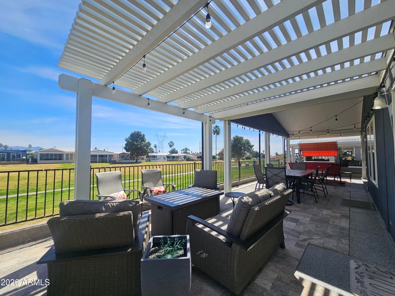 Listing details for 650 Hawes Rd #2805, Mesa, AZ 85207 : Experience luxury living in this spacious triple-wide home, perfectly situated on the golf course with breathtaking views of both the fairways and the Superstition Mountains. Step onto the expansive travertine patio, measuring an impressive 14x44 feet, where you can relax under the covered area for shade or bask in the sun beneath the pergola.