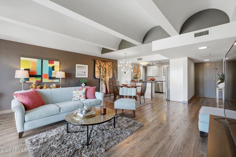 Listing details for 6502 Central Ave #C301, Phoenix, AZ 85012 : Striking mid-century modern 2 bed, 2 bath condo located at The Olympus, one of Phoenix's architecturally noteworthy communities designed in 1964 by renowned architect Robert L. Starkovich. With its signature arches and breeze-block detailing, this iconic gem of only 36 units is located in the heart of the North Central Corridor. Walking distance from the valley's top rated restaurants, shopping, bars and much more. Hiking and biking are convenient along Murphys Bridle Path & parking is a breeze with 2 dedicated spaces in the underground garage. Appointed on the 3 rd floor, this spacious unit has coveted barrel vaulted ceilings in every room (the only floor with this unique architectural feature). Spacious floorplan with large great room is illuminated with a wall of glass that opens to a balcony overlooking the pool and club house. Remodeled kitchen includes refrigerator, RO system, shaker cabinets, quartz countertops, under-counter lighting, modern light fixtures & a pantry. Bathrooms include updated cabinets, black granite counters & preserved original Monarch wall tile. Laminate wood flooring throughout, in-wall speakers, large walk-in closets, laundry room with cabinets and a washer & dryer complete this one-of-a-kind space. The HOA covers cooling, heating, cox cable, water, trash, sewer, landscaping, heated pool and ground care. Don't miss this rare opportunity to be a homeowner in such a unique building that has been featured in Phoenix Home & Garden and is included in the National Register of Historic Places.