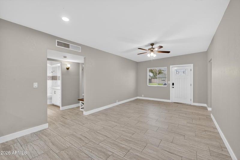 Inside, the gates open to an open-concept great room where light floods in like a desert sunrise. The kitchen is your command center, armed with gorgeous quartz countertops throughout and stainless steel appliances, including a gas range, dishwasher, and microwave, built to fuel both feasts and late-night victory meals.