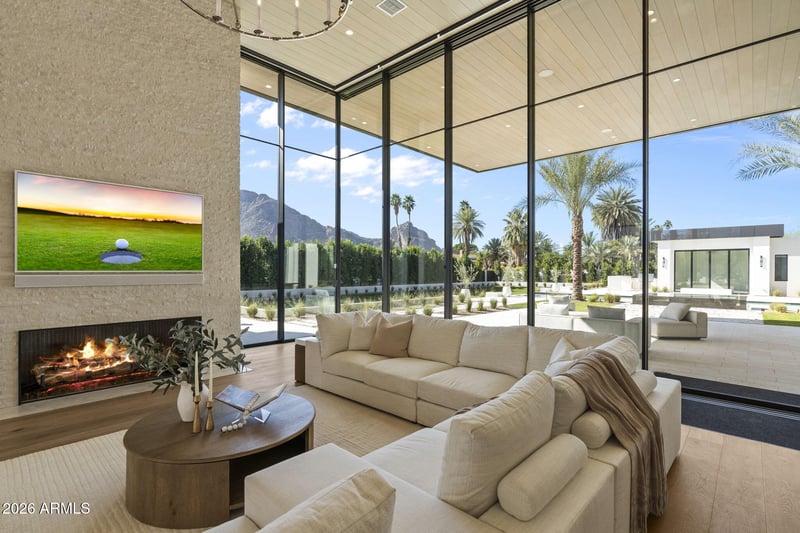 The Great Room opens to epic views of Camelback Mountain, with 18ft tall motorized pocketing doors to match the impressive ceilings, seamlessly blending indoor & outdoor living.