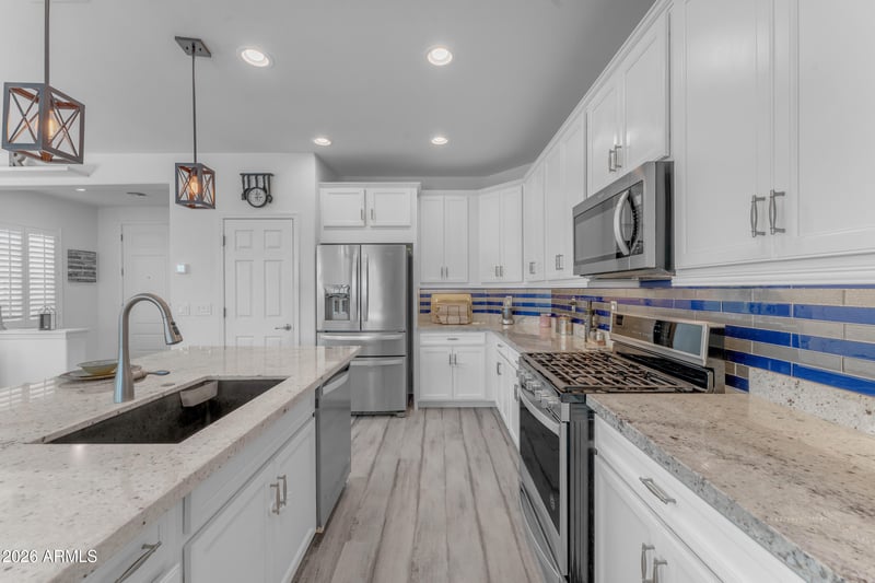 Listing details for 653 202nd Dr, Buckeye, AZ 85326 : Brand New Luxury Vinyl Plank flooring installed. Don't pass this home up. 3 bed/2 bath plus den in Blue Horizons in Buckeye! Open layout with lots of natural light, high ceilings, a neutral palette, classic plantation shutters, and beautiful flooring. The gourmet kitchen showcases granite counters, crisp white cabinetry with crown moulding, pendant/recessed lighting, a tile backsplash, stainless steel appliances, a walk-in pantry, and an island with a breakfast bar for casual meals. You'll also find a den, could be a 4th bedroom. A versatile space for work or play.The primary bedroom boasts an ensuite with double sinks and a walk-in closet and a large tiled shower. Enjoy breathtaking sunsets in the large backyard, complete with a putting green and a covered patio for outdoor dining. This home can be sold FULLY FURNISHED. Blue Horizons community features amazing parks great for family get togethers, complete with sand volleyball courts, basketball, soccer fields and multiple play areas. Close to I-10, Costco, Verrado shopping and just 20 minutes to downown Phoenix. Near multiople hiking, biking and recreational areas. A rated schools and so much more. Make this awesome listing your new home.