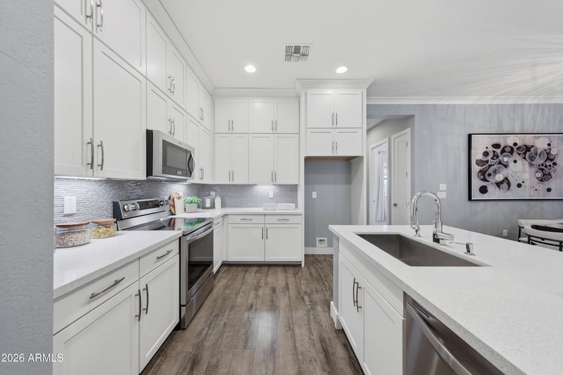 Listing details for 6565 Thomas Rd #1099, Scottsdale, AZ 85251 : ***$45K PRICE REDUCTION!!*** Live moments from the energy and charm of Old Town Scottsdale in this beautifully upgraded luxury condo, ideally located just steps from the pool and surrounded by Scottsdale's most sought after attractions. Inside, designer details elevate the space with Armstrong laminate wood floors, crown molding, upgraded chandeliers, and custom drapery throughout. The kitchen blends style and function with quartz countertops, an abundance of white cabinetry, stainless steel appliances, and a custom built in media center anchoring the living area. The guest bath offers dual sinks and a classic subway tiled shower and tub, while the spacious primary suite features a walk in closet and a spa inspired bath with penny round mosaic tiled dual sinks and a separate shower and tu An EV car charging station in the garage adds modern convenience. Just minutes from Scottsdale Fashion Square, Phoenix Zoo, and the dining, shopping, and nightlife of Old Town. Effortless luxury in a truly prime Scottsdale location!!!