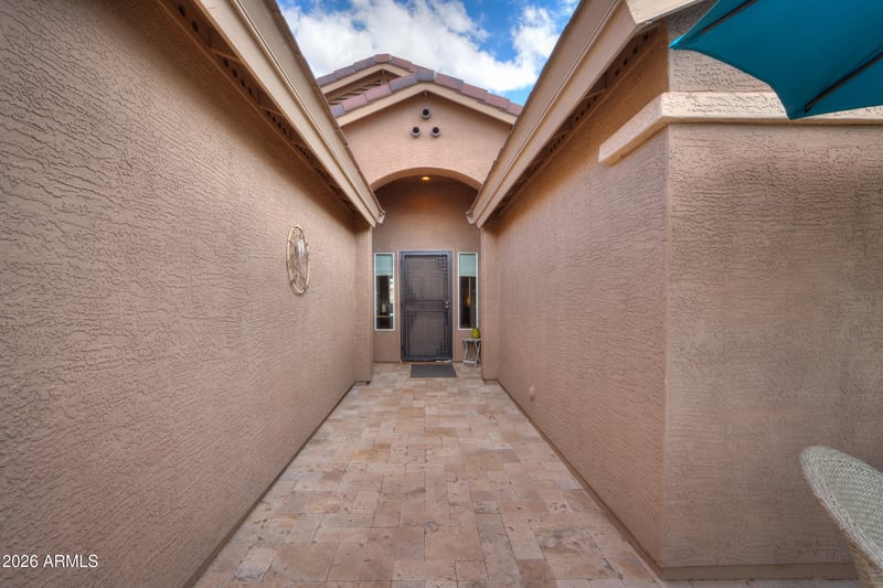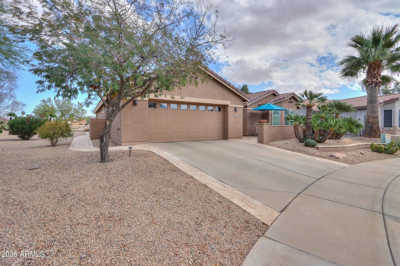 Listing details for 66 Laura Ln, Casa Grande, AZ 85194 : Enjoy resort-style living in this beautiful home within one of Casa Grande's most popular active adult communities, Mission Royale. This beautifully maintained 2 bedroom, 2 bath home plus den sits on the golf course & offers stunning views & thoughtfully designed indoor-outdoor living. A welcoming front courtyard with Travertine tile, security door & custom tile inlay at the entrance sets the tone for this home. Inside, you'll find tile flooring throughout with carpet in the bedrooms, along with vaulted ceilings, recessed lighting & ceiling fans that create an open, airy feel. The eat-in kitchen with a bay window provides a bright dining space. The kitchen also features counter seating, granite countertops, a decorative tile inlay backsplash & rich cherry cabinets with molding & hardware, combining style with functionality. The primary suite is spacious with a bay window, walk-in closet & an ensuite bath featuring a raised, tiled dual-sink vanity & tiled walk-in shower with bench seating. The guest bedroom also includes a bay window, while the den is highlighted by French doors, making it ideal for a home office, hobby room, or additional guest space. Step outside to an extended Travertine-tiled patio where you can take in gorgeous golf course views. The backyard is designed for entertaining & relaxation with a fire pit area, multiple conversation spaces & easy-care desert landscaping. The home also includes garage complete with cabinets & a side entry, a water softener & reverse osmosis system, adding comfort & convenience to this exceptional golf course property.