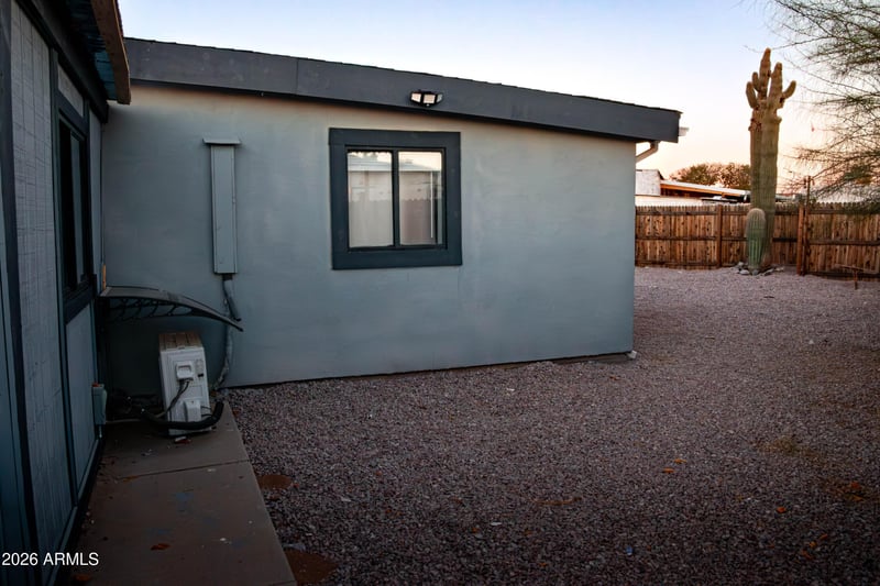 Listing details for 661 Saguaro St, Casa Grande, AZ 85122 : Newly remodeled single wide home with 1 bedrooms, 1 large bathroom attached with own separate AC split unit. Large, oversized laundry room can be converted into 3rd bedroom. Home has approx. 1,100 s/f with gas stove, microwave appliances, dishwasher and refrigerator in the eat in kitchen, new kitchen sink, Corian countertops and wood planked back splash. Home has been completely updated interior with new remodeled bathroom with walk in shower. LED lighting, tile flooring. Large exterior patio with fenced yard. Two RV Gate and RV parking slab. Also has a 2 car carport. Brand New 100-amp electric service. ***THERE IS ROOM TO EXPAND THE FOOTAGE*****