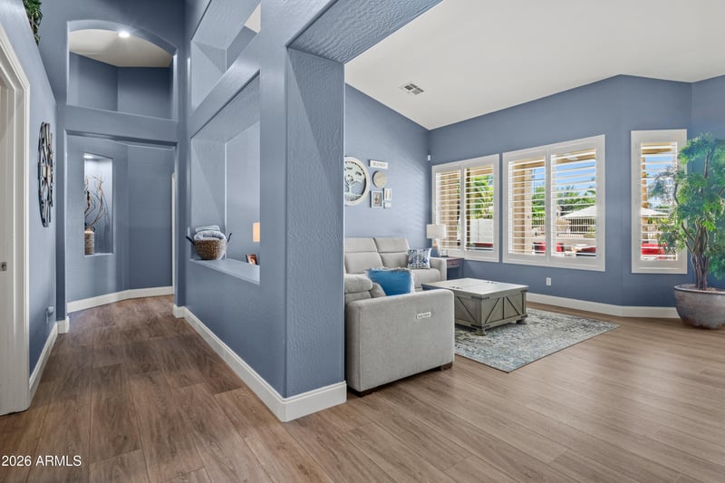 Listing details for 665 Goldfinch Way, Chandler, AZ 85286 : Single-level home on an oversized premium greenbelt lot with North/South exposure and expansive open-sky views, offering rare privacy and space. Extensively upgraded since 2024, featuring a fully remodeled kitchen w/quartz waterfall countertops, matching backsplash, and new appliances including gas cooktop, wine fridge, and ice machine, plus a custom bar. Interior improvements include new paint (2024), all-new flooring, updated lighting and ceiling fans, and a remodeled guest bath. Major system upgrade includes a full PEX plumbing repipe (2021). Enjoy a resort-style backyard with a saltwater heated pool and spa, remote-controlled lighting and water features, a built-in gas BBQ with fridge, lush grass area, natural stone pavers, and a mature shade tree. Plan a tour today! The open, functional layout provides separate living and family rooms, formal and casual dining, and a flexible den/office. Remodeled primary suite features a walk-in closet, raised slab vanities with under-mount sinks, built-in vanity, upgraded fixtures, seamless glass shower, and private water closet. Additional highlights include a 3-car garage, Kinetico water softener and RO system, dual-pane windows, and dual-zone gas HVAC. Walkable to top-rated Chandler schools, dining, and shopping--offering move-in-ready comfort with modern upgrades and seamless indoor-outdoor living.