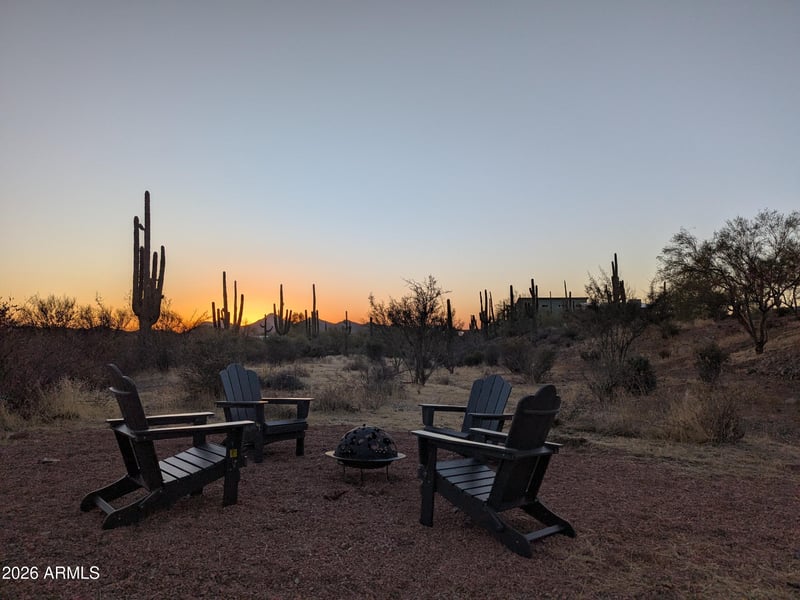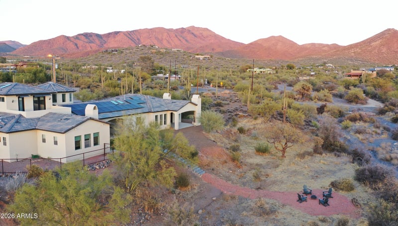 Listing details for 6737 Rockaway Hills Dr, Cave Creek, AZ 85331 : Stunning Sonoran Desert setting on 2.2 private acres with mountain views and breathtaking sunsets. Thoughtfully designed 5 bedroom open layout, chef's kitchen with large island, butler's pantry and premium appliances. Primary bedroom with gas fireplace and dual custom closets. Upstairs guest suite with bedroom, sitting area, full bath and balcony. Covered patio and fireplace open to natural desert expanse. 4 car garage (3+1 separate bay), owned solar, Insulated Concrete Form (ICF) wall construction provides excellent insulation, newer roof. Horse property permitted.