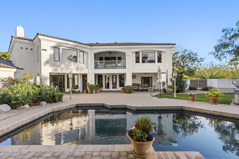 Upstairs, the spacious primary suite serves as a peaceful retreat. The split floor plan offers added privacy with a separate secondary bedroom and an additional bonus room -- perfect -- perfect for a private living area, media room, home office, or guest retreat. Just off the upper level, a covered balcony patio overlooks the backyard oasis, providing the perfect spot for morning coffee or evening relaxation. Downstairs there are two more en suite bedrooms with built-in desk areas. A fifth bedroom could be used as an office space or bedroom and has a full bathroom adjacent. With its private setting, flexible floor plan, light-filled interiors, and resort-style backyard, this home offers comfort, functionality, and lifestyle all in one exceptional property. While so many are purchasing lots for much more in Paradise Valley, this home offers a well maintained home that is move-in ready and provides many options too!
