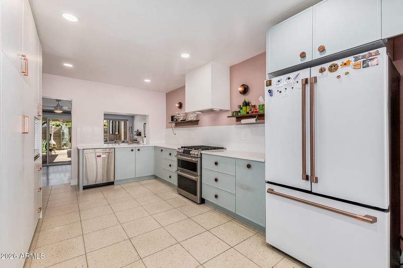 Listing details for 6811 11th Pl, Phoenix, AZ 85014 : Mid-Century Modern dream home in North Central. The stunning kitchen features GE Cafe appliances, custom cabinetry, quartz countertops & backsplash, and a sunny breakfast room. Major system improvements by a previous owner include sewer line replacement & electrical updating, recessed lighting & raised hall ceilings. Updated flooring throughout, including finished concrete & terrazzo tile. Hall bath was renovated with new flooring, vanity, custom cabinetry, and custom-poured terrazzo countertop. Primary bathroom has also been beautifully remodeled. Living room features a gas fireplace and custom wine bar. In addition to the main home, there is a detached structure ideal for a private office/studio/flex space. Reimagined yard has extensive covered patio with lights, fans, blinds.
