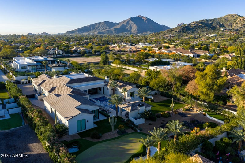 Listing details for 6830 Hummingbird Ln, Paradise Valley, AZ 85253 : Discover resort-style living in this privately gated Paradise Valley estate, perfectly positioned to capture striking Mummy Mountain views. A lush, welcoming front courtyard sets the tone with a firepit, fountain, citrus trees, and an expansive lawn. Inside, wood-paneled ceilings and white oak flooring lead to a private office and inviting family room. The open-concept great room highlights a full wet bar, temperature-controlled wine cellar, and a wall of sliders that open seamlessly to the Arizona room with a dramatic dual indoor/outdoor fireplace. The chef's kitchen is the heart of the home, showcasing dual islands, a gas range, high-end appliances, a butler's pantry, walk-in pantry, and a charming breakfast nook. A split floor plan enhances privacy, and the luxurious primary suite offers its own fireplace and sliders to a secluded courtyard with firepit. The spa-inspired bath features dual vanities, dual walk-in closets, dual private toilets, an oversized shower, and a soaking tub. Guests will appreciate the fully appointed casita, complete with kitchen, walk-in closet, and washer/dryer. Car enthusiasts will love the 4-car garage plus an additional 2k sqft versatile bonus space with built-in storage, wet bar, refrigerator, TV area, gym, sauna, cold plunge, direct access to the full outdoor pool bath, and RV gate and garage door for additional vehicle storage option. The backyard is an entertainer's dream, offering a heated saltwater pool with water and jet features, spa, an outdoor kitchen with BBQ, fridge, and smoker, along with misters and heaters for year-round enjoyment. A TV-equipped ramada, multiple fire pits, putting green, and charming chicken coop complete the experience. This smart home offers automated control of security, lighting, music, shades, pool, and misters. Located moments from Paradise Valley's premier resorts, world-class golf, fine dining, and upscale shopping, this exceptional estate delivers the ultimate blend of luxury, comfort, and Arizona indoor/outdoor living.