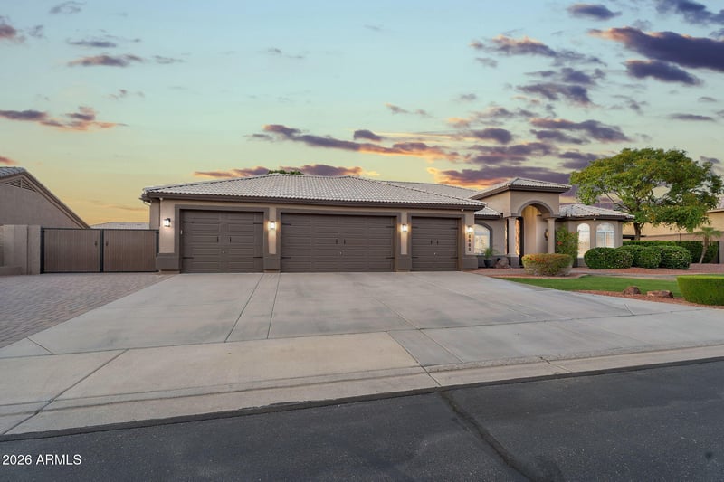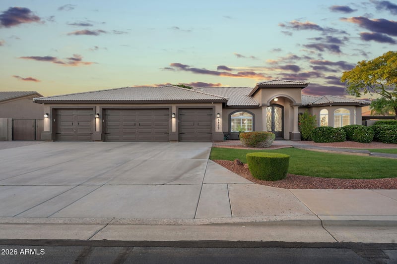 Listing details for 6862 Mallory St, Mesa, AZ 85207 : Discover exceptional living in this beautifully upgraded single-level North Mesa home, perfectly positioned near Red Mountain 202 for quick access across the Valley. Situated in a non-HOA neighborhood on a generous 16,000 sq ft lot, this property offers rare amenities including a 4-car garage + a 2018-built RV garage, resort-style outdoor living, & thoughtful craftsmanship throughout. A striking first impression begins at the iconic arched wrought-iron double door, standing an impressive 9.5 feet tall & 6 feet wide, w/ornate scrollwork & bronzed glass panels that open to welcome fresh air. Inside, architectural arches frame hallways, windows, & entryways, while soaring vaulted ceilings & 24'' x 48'' porcelain tile create a bright, elegant flow. Brand-new neutral carpet softens each bedroom The formal living room is anchored by a grand 16-lamp wrought-iron chandelier and a large arched window overlooking the backyard oasis. Additional can lighting throughout the home ensures every space feels light and inviting.