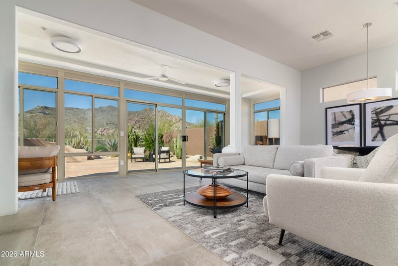 Listing details for 6862 Nightingale Star Cir, Scottsdale, AZ 85266 : Unobstructed backyard Black Mountain views are the headline here. This is the view buyers want in Terravita, behind the home where you actually spend your time. The north-facing preserve lot keeps it private and gives you soft, usable light all day. Inside, the great room floorplan just works. The kitchen, dining and living areas are open to each other and open to the patio through a full wall of glass, so the backyard becomes part of the living space. It feels comfortable, not oversized, and there is no wasted space. The home is offered fully furnished with quality, classic pieces, so it is truly move-in ready. If you are looking for view, privacy and the right floorplan in Terravita, this one checks the boxes.