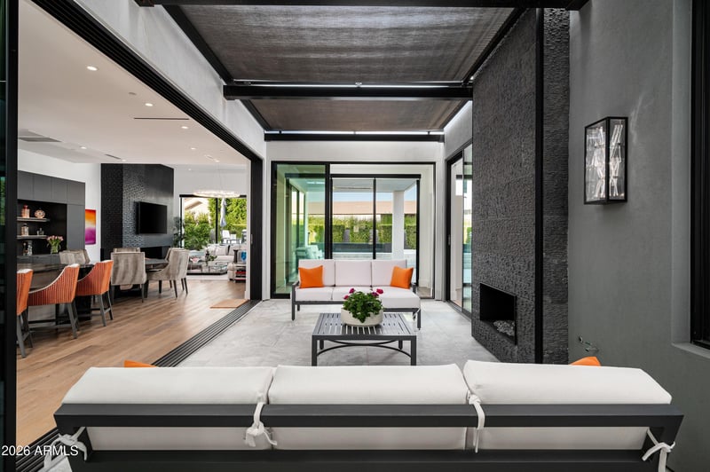 At the center of the home, the courtyard delivers on the true meaning of indoor-outdoor living. Marble pavers underfoot, a cozy fireplace, and a retractable shade equipped with wind and rain sensors create a space designed to be enjoyed year-round. Expansive glass panels open from the four surrounding walls, seamlessly blending the interior with the outdoors in a way that genuinely feels effortless.
