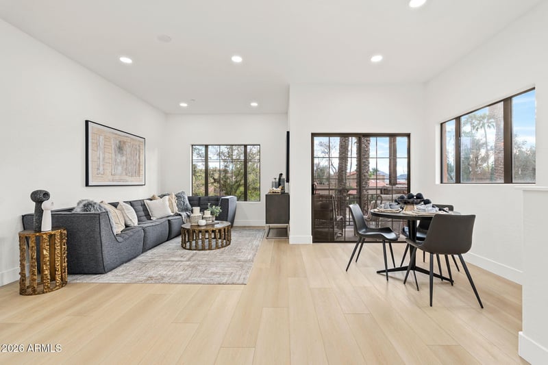 Listing details for 6940 Cochise Rd #1001, Paradise Valley, AZ 85253 : Discover luxurious living in this extensively renovated end-unit townhome in prime PV / N Scottsdale. Soaring ceilings and ample natural light fill the space, complemented by a private 2-car garage. The flexible split-level layout includes a secluded downstairs bedroom with full bath and laundry, plus an upstairs primary suite with en-suite bath for ultimate privacy and comfort. The modern kitchen boasts a gas range, stainless appliances, quartz countertops, and chic finishes, with a breakfast bar flowing into the expansive living/dining area that opens to a balcony offering Camelback Mountain views. Outside, a gated courtyard provides security, while the community features a sparkling pool and grilling area. In an unbeatable location with top amenities, this gem won't last. Welcome home!