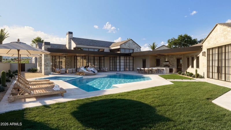 Listing details for 6946 Gary Rd, Scottsdale, AZ 85254 : Set on a highly sought-after corner lot in the prestigious Cactus Corridor, this exceptional luxury residence offers an unparalleled blend of scale, craftsmanship, and location. Situated on just under an acre, the property encompasses 7,778 square feet total, including a 6,817 sq ft main residence and a beautifully appointed 961 sq ft guest house. The main home features 4 spacious bedrooms, a dedicated office, an expansive game room, and 5.5 bathrooms, all thoughtfully designed with luxurious finishes throughout. A 4-car air-conditioned garage tall enough for lifts provides ample space for collectors and everyday convenience alike. The private guest house offers a one-bedroom, 1-bath retreat with a large living room, perfect for visitors or extended stays. Inside, the home showcases refined, modern luxury with custom natural oak cabinetry accented by warm copper tones, Mykonos-edge profile countertops, and elegant hardwood flooring. The chef's kitchen is a true centerpiece, equipped with top-of-the-line Wolf and Sub-Zero appliances, including a built-in double oven, professional-grade coffee system, and an adjoining butler's pantry for seamless entertaining.