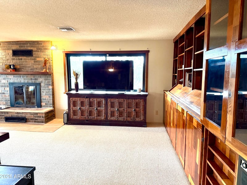 Custom wood built ins, wood burning fireplace, and stainless steel kitchen appliances.