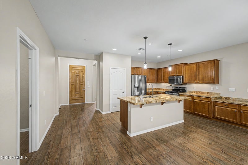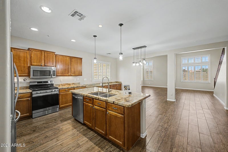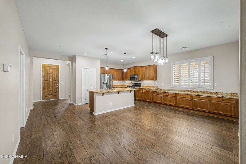 Listing details for 6962 Ashby Dr, Peoria, AZ 85383 : Brand New interior paint April 2026! This beautiful 5 + 3 home in the highly desirable Sonoran Mountain Ranch friendly neighborhood is a must see! Near the new TSMC chip plant! Spacious & open floorplan with beautiful plantation shutters throughout & tile plank floors downstairs. Large kitchen with huge cabinet space, granite counters, hickory cabinets, rollout drawers & sizeable island perfect for entertaining. The living room boasts tall vaulted ceilings and a built in gas fireplace with stone surround. There are TWO bedrooms downstairs & convenient 1st floor laundry. Upstairs is the large primary bedroom w/mountain views, a large walk in closet, en suite bath w/separate roman tub. Additional primary bedroom upstairs where 2 bedrooms were converted into 1 large room w/jack and jill bath. (slider doors in garage can be re-installed to separate the 2 rooms) Peaceful low maintenance backyard w/pool & new Pentair filter in 2025 and new pool pump March 2026. Most windows have sunscreens to keep out the heat. Garage has 220V, a utility sink & storage racks above w/new garage door opener in 2025. Ceiling sprinklers throughout home and garage. Wifi is wired for every room. Come see this meticulously maintained home with amazing floorplan today!