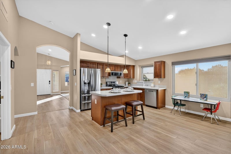 Listing details for 700 Gascon Rd, San Tan Valley, AZ 85143 : Incredible value on this move-in ready, single-story 3 bedroom plus den home, with the den easily convertible to a 4th bedroom. It shows like a model and offers more than nearby new construction without the wait. Upgraded LVP flooring throughout the main living areas gives the home a clean, modern feel and highlights the upgraded cabinets and quartz countertops in the kitchen. Added canned lighting brightens the entire home, and the kitchen includes new stainless microwave and refrigerator. Extras include a water softener, with refrigerator, washer, and dryer all included. Leased Tesla solar is prepaid in full through 2033 for long-term energy savings. The backyard features lush real grass and an RV gate. Finished, upgraded, landscaped, and ready now.
