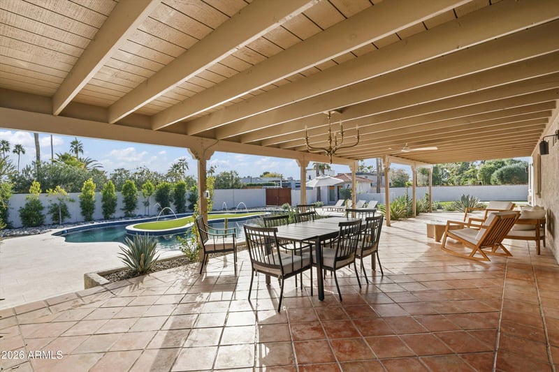 Listing details for 7001 Thunderbird Rd, Scottsdale, AZ 85254 : Professionally designed and fully furnished, this exceptional residence has undergone a extensive fully permitted renovation. Offering the feel of new construction on a private, nearly one-acre corner lot in one of the Valley's most desirable locations. The thoughtfully reimagined layout features 5 bedrooms and 4 bathrooms, including dual en-suites, a redesigned kitchen with double appliances, raised ceiling height, electric fireplace and designer finishes throughout. Extensive upgrades include owned solar, new roof, major plumbing and electrical improvements, new windows and doors, EV charger, smart garage and gated RV access. The fully redesigned backyard delivers a true resort experience with a rebuilt heated pool featuring a lazy river and island, pickleball court, putting green with bunker, bocce court, life-size chess board, built-in fire pit, and BBQ and a dedicated wellness space with gym, sauna, and cold plunge. Many of the features are app-controlled for modern convenience. Approved plans and permits are in place for a 1-bedroom / 1-bath ADU and convey with the sale, offering flexibility for guest accommodations, home office, or multigenerational living. Walkable to dining and shopping while maintaining exceptional privacy, this turnkey home blends refined design and lifestyle in a rare centrally located setting.