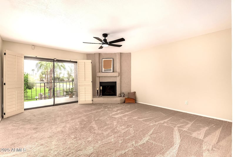 Enjoy the elegance of plantation shutters framing peaceful Golden Hills golf course views right from your living space.