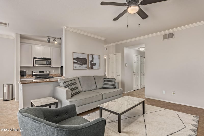 Listing details for 7009 Acoma Dr #2002, Scottsdale, AZ 85254 : FULLY FURNISHED stylish well-maintained 2-bedroom, 2-bath condominium which features a one car garage located in the highly sought-after Plaza Residences. This thoughtfully designed split floor plan offers privacy and functionality, ideal for full-time living, a second home, or an income-producing opportunity. The open-concept layout features a bright living space that flows seamlessly into the kitchen, complete with granite countertops, ample cabinetry, and a breakfast bar--perfect for both everyday living and entertaining. The spacious primary suite includes a walk-in closet and private bath, while the secondary bedroom is well-positioned for guests or a home office. Close by enjoy Kierland Commons and Scottsdale Quarter. Step out onto your private balcony, the perfect place to unwind. Residents enjoy resort-style amenities including heated pools, spa, fitness center, and lush, well-maintained grounds. Flexible rental opportunity--this community allows short-term rentals with a minimum 30-day stay, making it an excellent option for seasonal income or part-time use.