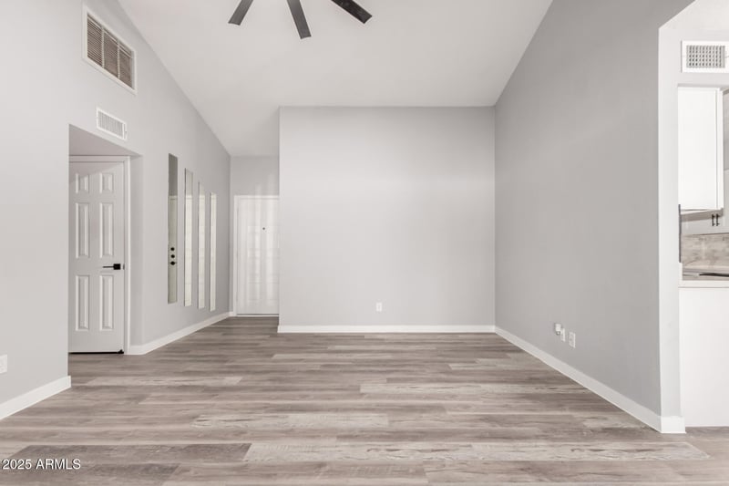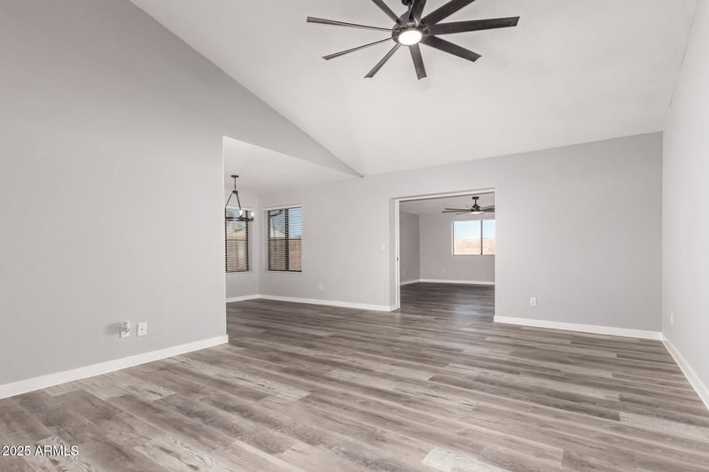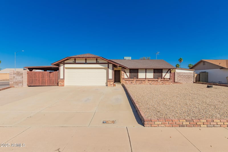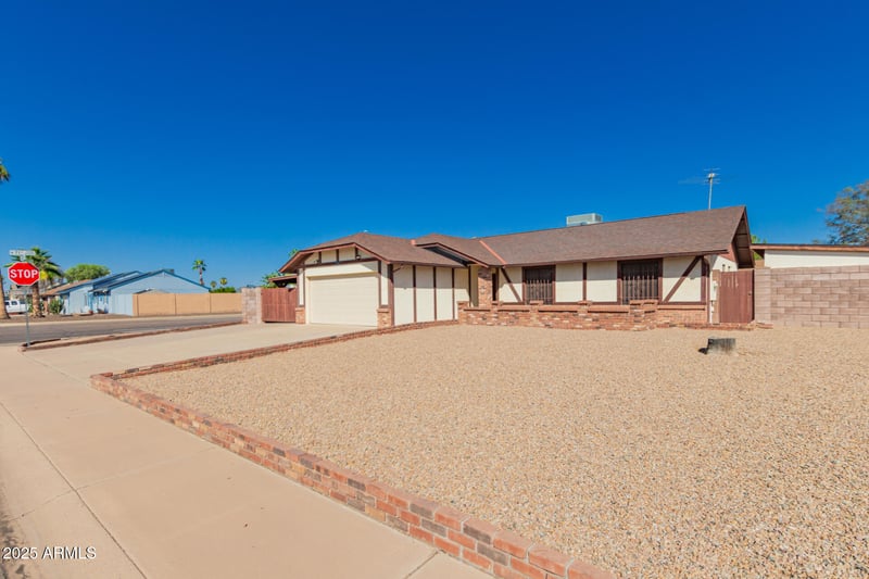 Listing details for 7044 Cameron Dr, Peoria, AZ 85345 : Adorable 3-bedroom home with no HOA! Nestled in a desirable corner lot with a charming curb appeal, featuring a 2-car garage with attached storage & RV gates! Inside, you'll find soaring vaulted ceilings adding an airy feeling, wood-look flooring, and neutral paint that complements any decor. The galley-style kitchen is complete with white shaker cabinets, tile backsplash, quartz countertops, a walk-in pantry, and stainless steel essentials. Relax in the main bedroom, including a private ensuite and a walk-in closet with attached organizers. Enjoy weekend grills in the easy-maintenance backyard, equipped with a covered patio ideal for morning coffee and a separate workshop waiting to see your projects! What's not to love? Make it yours now!