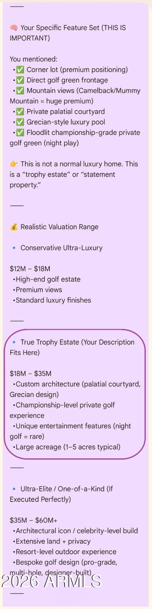 Listing details for 7155 Oakmont Dr, Paradise Valley, AZ 85253 : There is ultra-luxury, and then there is this true Unicorn, Statement Property, and Trophy Estate. This award-winning, completely rebuilt, corner golf green home is located in the most expensive neighborhood in the Southwest United States. In addition to the five centerpiece Unicorn features described below, this Legacy home's Unicorn status is underscored by its designation as the #1 Single-Family Home rental in Arizona with $51K in monthly rental revenue. This turnkey home's distinguished prior mid-term (multi-month) vacation rental tenants include A-list celebrities, superstars, and even billionaire tenants arriving in personal helicopters while renting this home. This Santa Barbara estate occupies the best lot in the heart of a storied Paradise Valley neighborhood, where homes that have sold for $15M+ would rent (even on their best day) for less than half this home's rental revenue of approximately $51K per month. Therefore, this Unicorn home is a monetized hard asset. The difference in the valuation of a monetized hard asset (for example, Facebook with advertising revenue) and an unmonetized hard asset (for example, Facebook without advertising revenue) is night and day.
