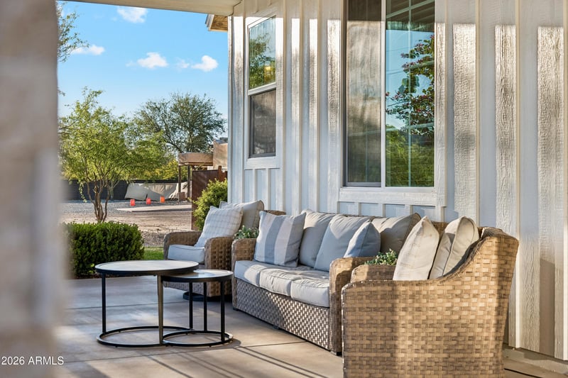 Step outside to an entertainer's dream backyard with over 3,000 square feet of lush grass, mature fruit trees, and multiple gathering areas. Enjoy the resort-style pool with a large baja shelf, travertine decking, pergola, fire pit, and extended covered patio with custom wood detailing. The yard also includes a playground, sandbox, in-ground trampoline, and space to enjoy Arizona living year-round.