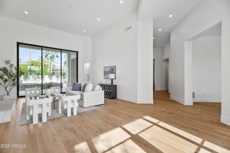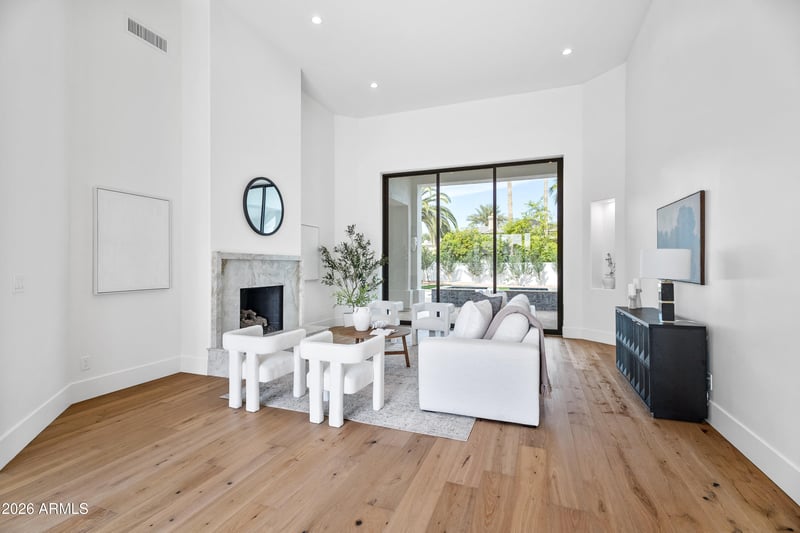 Listing details for 7180 Belmont Ave, Paradise Valley, AZ 85253 : Located in the guard-gated Cheney Estates of Paradise Valley, this newly renovated residence combines refined design, high-end finishes, and seamless indoor-outdoor living. A striking entry features a brand-new black iron and glass front door by Pinky's with custom iron gates. The light-filled interior offers high ceilings, wide-plank oak hardwood flooring, wood-paneled ceilings, arched entryways, and inset custom Adler solid wood cabinetry throughout. New windows and sliding doors enhance natural light and connectivity to outdoor spaces. The thoughtfully designed floor plan includes formal living and dining rooms with fireplace, as well as an open-concept family room and kitchen with direct access to outdoor patios. The chef's kitchen features Taj Mahal quartzite countertops with waterfall island, custom quartzite sinks, Wolf and Sub-Zero appliance suite including gas range with pot filler, drawer microwave, and separate refrigerator and freezer, hidden walk-in pantry, and a custom dry bar with dual beverage refrigerators and marble tile backsplash. The primary suite includes a gas fireplace and a spa-inspired bathroom with champagne bronze fixtures, custom quartzite dual sinks, and a fully tiled marble shower with floor-to-ceiling glass. Direct access leads to a private backyard with outdoor shower. California Closets build-out credit available for buyer customization. The resort-style backyard features a pool with swim jets, Baja shelf, bubbler, deck jets, and a 12-person built-in spa with waterfall. Brand-new front and rear landscaping includes travertine hardscape, natural grass, privacy ficus, and oleanders. Additional features include a new roof with 10-year transferable warranty, newly serviced HVAC systems (2020 and 2024), new Sienna windows and Fleetwood sliding doors, designer lighting throughout, spacious laundry room with double washer/dryer setup and sink, solid marble floating sink in powder bath, and a three-car garage with epoxy flooring and EV-ready 220V charger. Ideally located near Paradise Valley's premier resorts, golf, shopping, and dining.