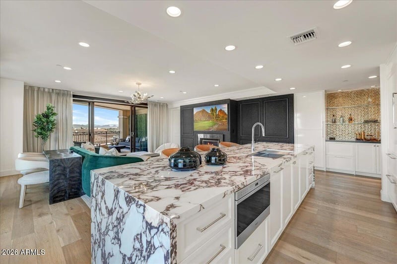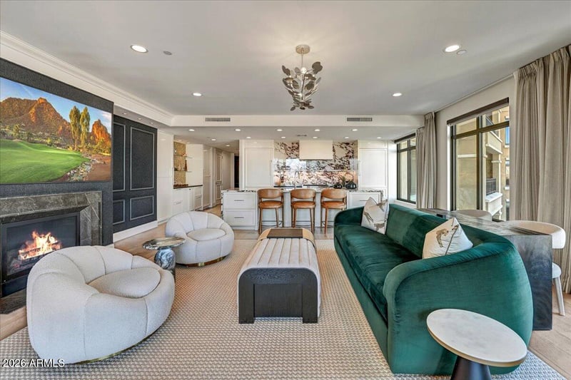 Listing details for 7181 Camelback Rd #505, Scottsdale, AZ 85251 : The most exquisite, sophisticated condo you'll find. Absolutely stunning, paying great attention to detail with the finest quality in every room. Beautiful cabinetry, counter tops and designer appliances in kitchen looking out to great room with gorgeous wall covering, fireplace, bar and drapery giving the feeling of splendor! The primary bedroom and bath were designed to surround one with elegance and beauty while including every need to pamper yourself. Spectacular views of Camelback Mountain and McDowell Range from every room and balcony! Complete smart home! Enjoy the luxurious lifestyle Scottsdale Waterfront has to offer including 24/7 front desk, valet and private underground parking, fitness center, elegant club room with private dining, rooftop pool, spa, wine cellar and BBQs!