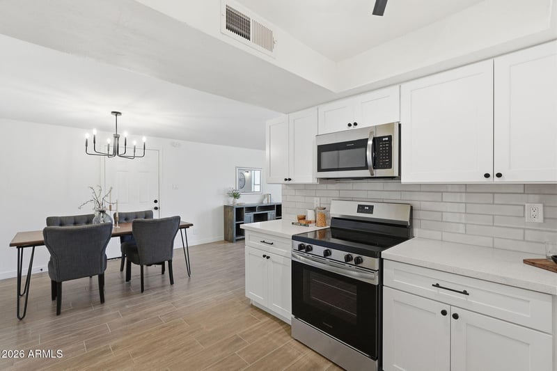 Listing details for 720 Dobbins Rd, Phoenix, AZ 85042 : Move-in ready South Mountain patio home with 2 beds and 2 baths. Features fresh paint, wood-look tile in main areas, and new carpet in bedrooms. The great room centers around a cozy wood-burning fireplace. Updated kitchen includes white shaker cabinets, quartz countertops, tiled backsplash, and stainless steel appliances. The primary suite offers a private bath with step-in tile shower. Enjoy a blank canvas backyard ready for your vision. Rare drive-thru garage plus detached AC workshop--perfect for hobbies or storage.