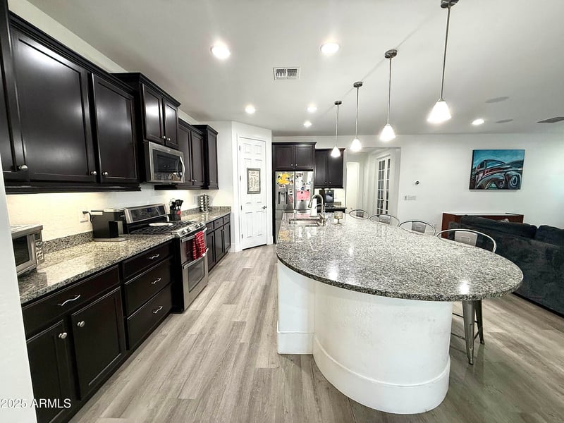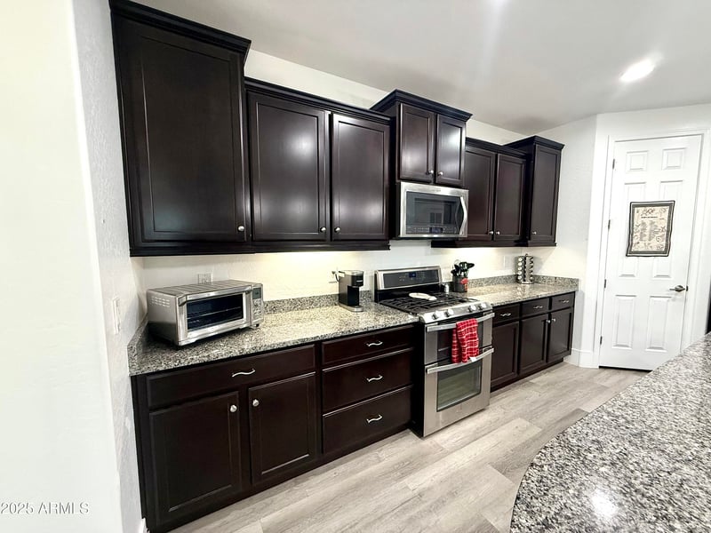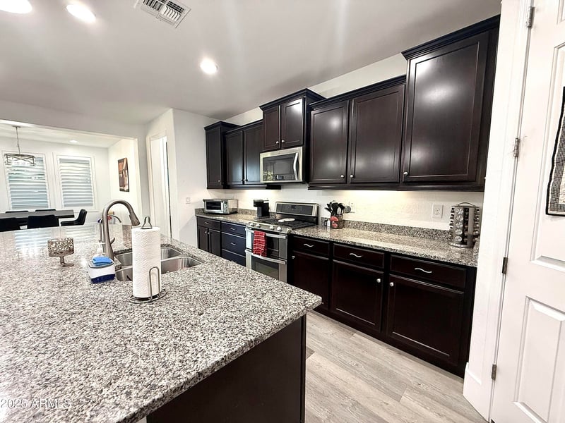 Listing details for 7265 Portobello Ave, Mesa, AZ 85212 : This stunning 3-bedroom plus den, 2.5-bath Mesa home is move-in ready with over $165,000 in upgrades. Interiors feature luxury vinyl plank flooring, oversized baseboards, fresh paint, 9-foot ceilings, and abundant natural light. The chef's kitchen offers granite countertops, an oversized island, soft-close cabinetry, and a walk-in pantry. The primary suite boasts an updated bath and spacious walk-in closet. Enjoy a resort-style backyard with a sparkling pool, low-maintenance landscaping, and covered patio, plus an entertainment center with a 72'' fireplace. Additional upgrades include a tankless water heater, RO system, smart home features, gutters, shutters with automatic patio shades, epoxy 3-car garage floors, and a security door on a prime corner lot next to the main park.