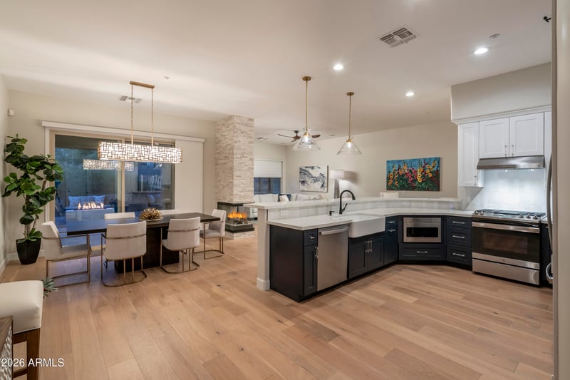 Clear sightlines connecting living, dining, kitchen, and patio